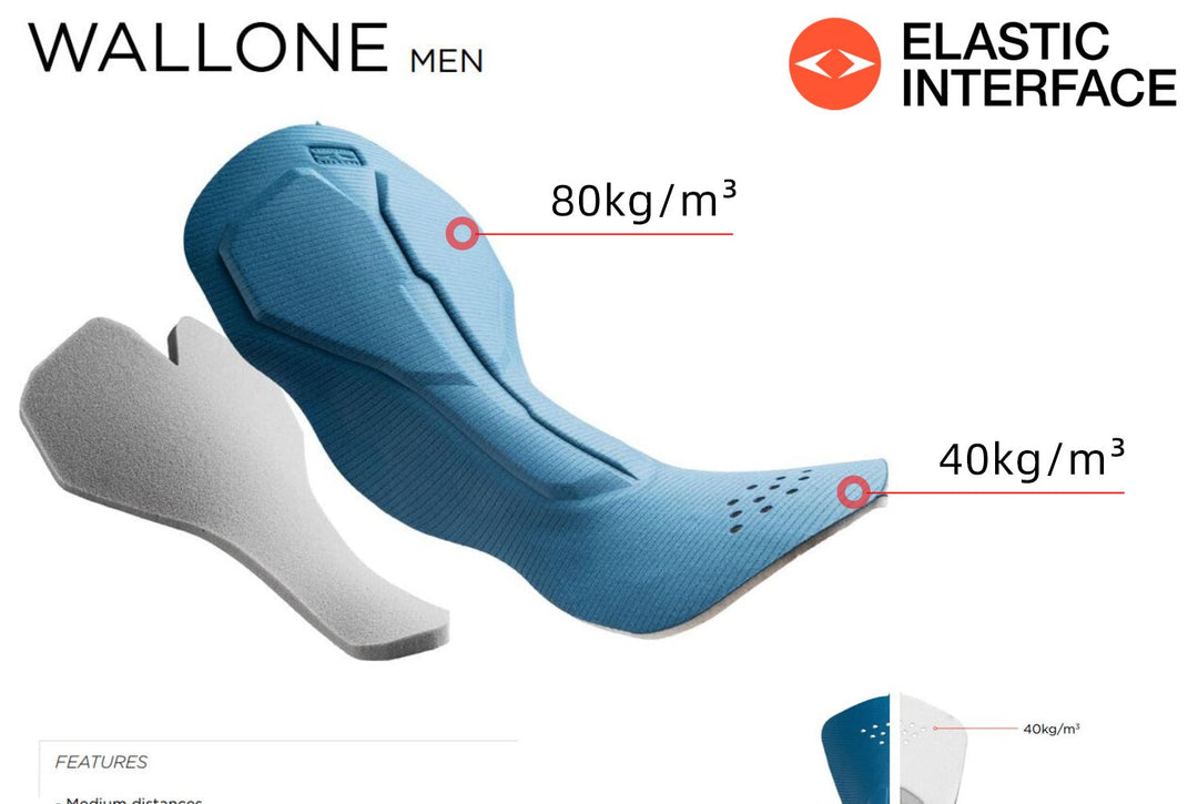 Aero Skinsuit adopt WALLONE Men Pad. Elastic Interface® WALLONE Men Pad: 80kg/m³ high-density support + 40kg/m³ comfort foam. Ideal for rides up to 4 hours. Smooth transitions and a seamless surface to prevent friction and enhance comfort.